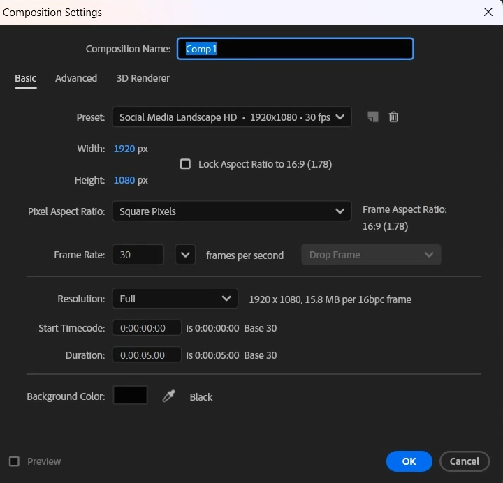 [Ctrl+N]로 1920*1080 크기 컴프창을 만들어 주세요.