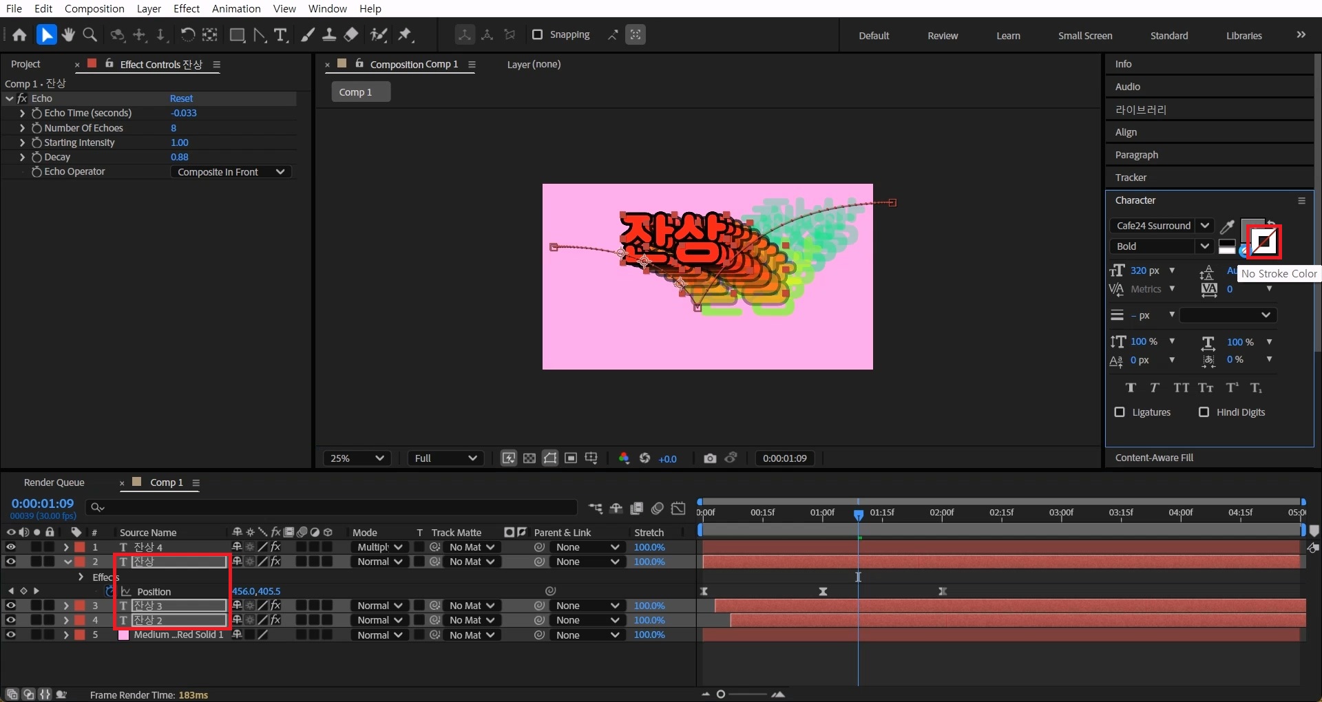 오늘은 간단한 효과로 텍스트 잔상 색을 러프하게 여러 색깔로 바꿔보도록 하겠습니다.