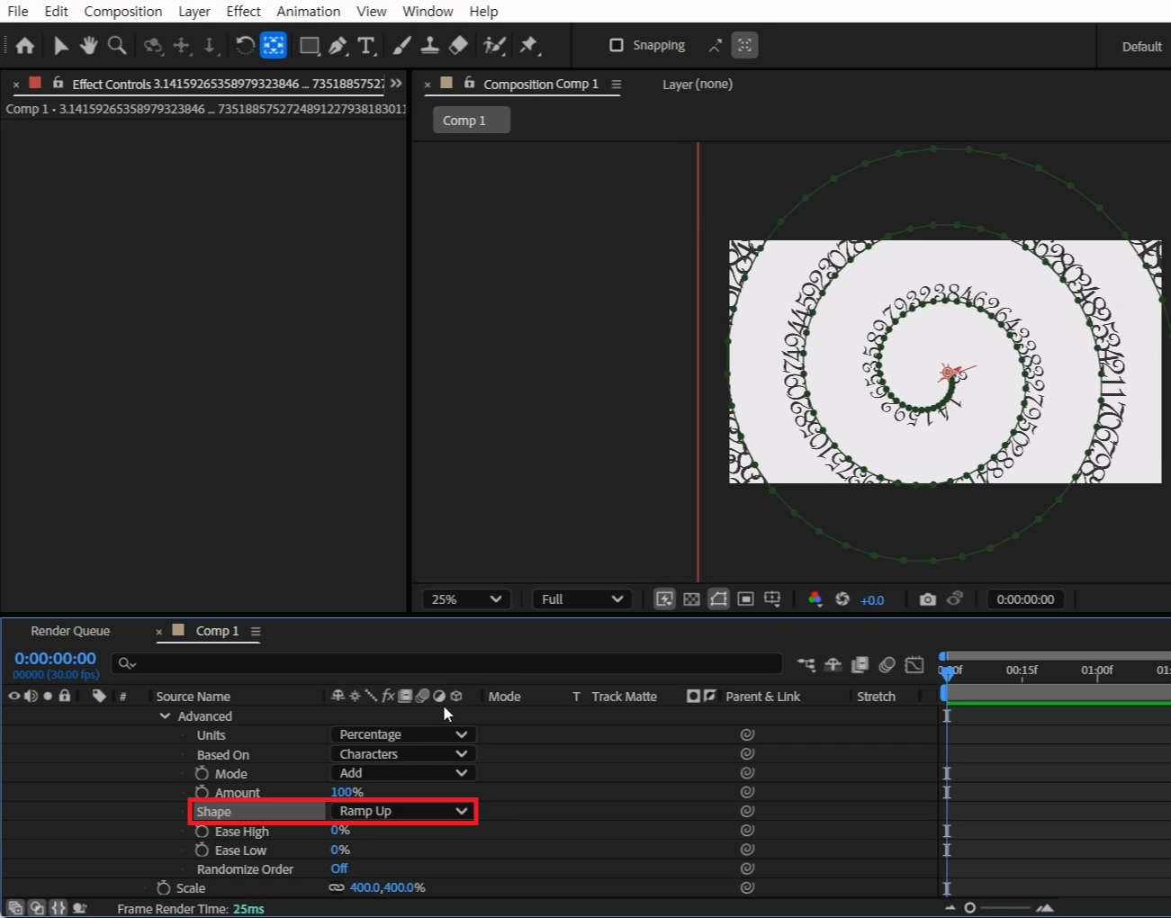 > Range Selector 1 > Advanced > Shape 옵션을 Ramp Down으로 선택합니다.