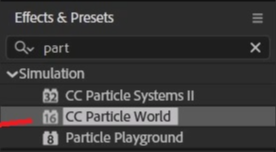 [Ctrl+5]로 Effects & Presets창을 열어 CC Particle World 검색해서