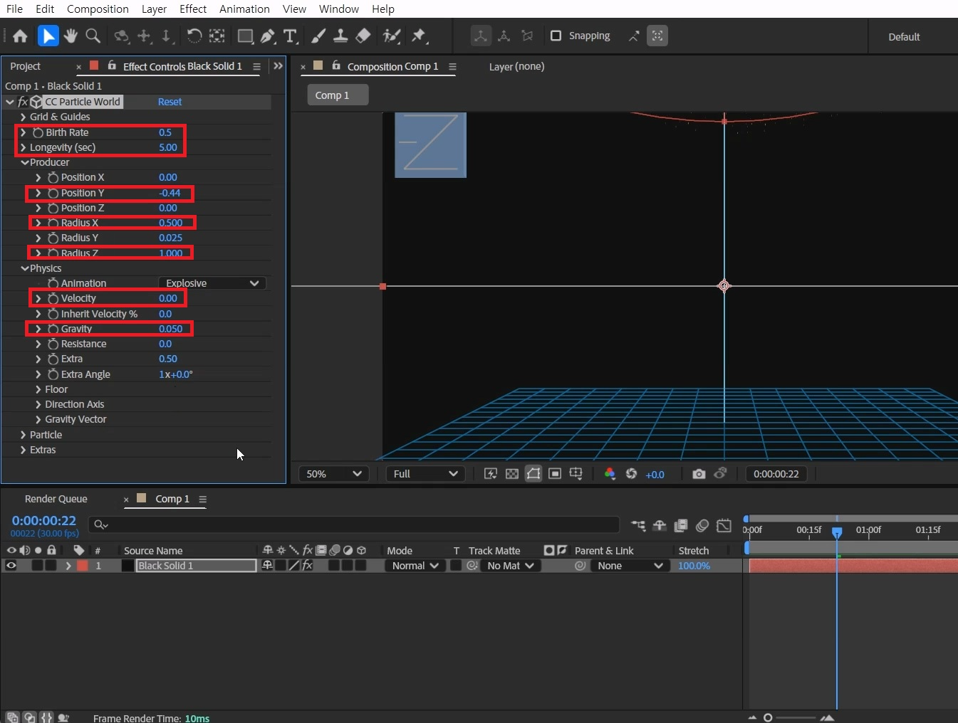 Brith Rate(파티클 겟수) 값을 0.5로 입력하고, Longevity(지속시간) 값을 5로 입력합니다.
