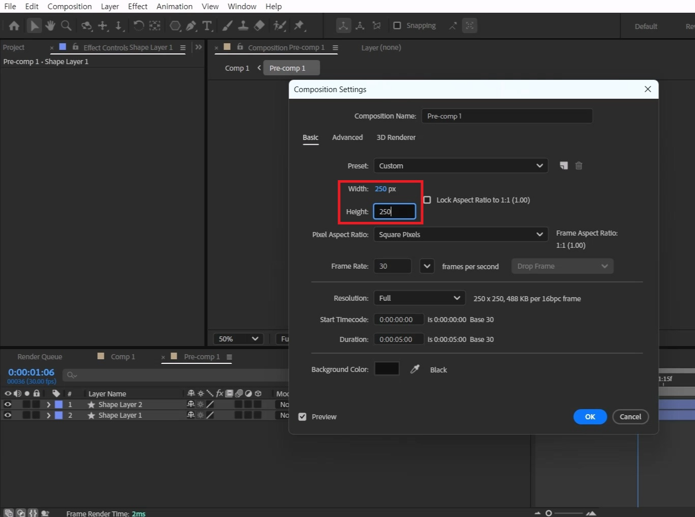 프리 컴프 안에 들가서 [Ctrl+K]로 컴프 사이즈를 250*250 크기를 조절합니다.