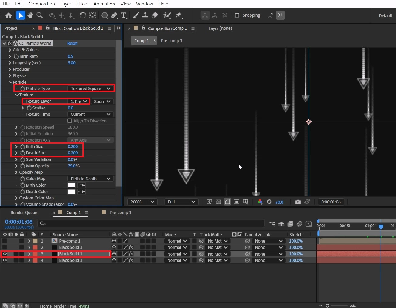 > Birth Size 값을 0.2로 늘려서 삼각형이 잘 보이게 만들어 주세요.