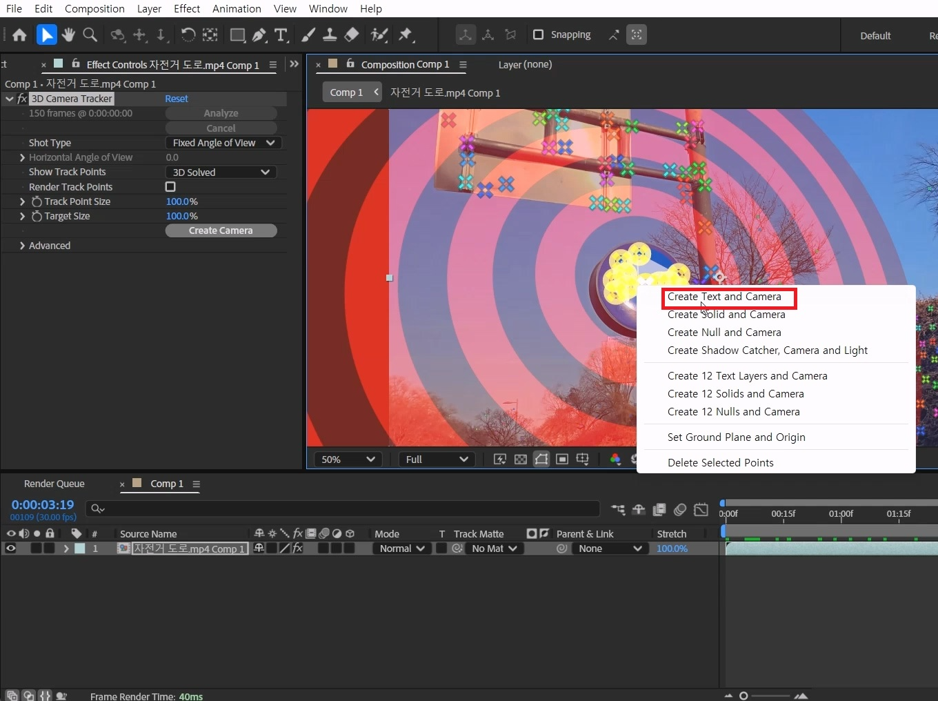 그 위에서 마우스 오른쪽 버튼을 누르면 메뉴가 나오는데, “Create Text and Camera”를 선택.
